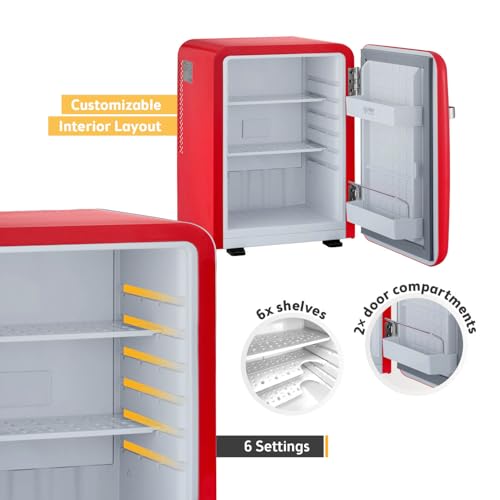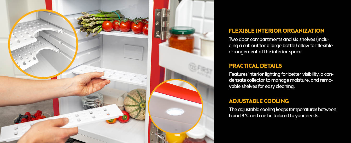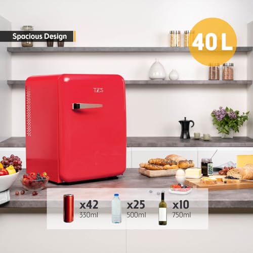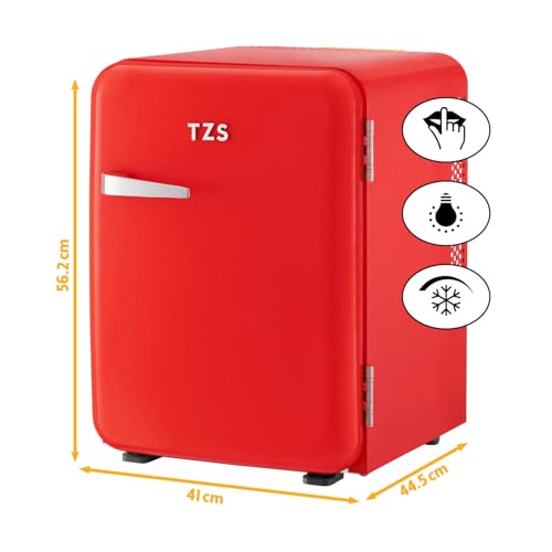 TZS First Austria – Retro Mini Fridge 40L Silent – Small mini fridge in vintage design with interior lighting & 2 door compartments – Minibar for camping, office, bedroom & hotel – red [Energy Class E]