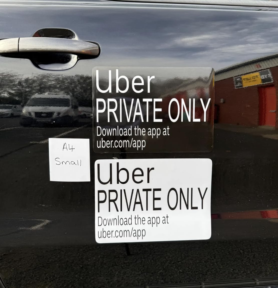 This set of two “Uber PRIVATE ONLY” magnetic car signs provides a clear, removable and professional way to identify your UK private hire vehicle. Each order includes a pair (x2) magnets for both sides of the car, ensuring maximum visibility for passengers and compliance with typical PHV expectations. Printed on high-quality vinyl with a durable gloss laminate, the signs offer bold, high-contrast lettering for easy visibility at pick-ups, taxi ranks or roadside stops. The industrial-grade magnetic backing attaches securely to metal vehicle doors and panels while remaining easy to remove at the end of your shift, leaving no residue or paint damage. Available in Large (570×300mm), A3 and A4, these magnets are suitable for most UK private hire vehicles including saloons, hatchbacks, estates and MPVs. Designed for British weather, they are waterproof, UV-resistant and stable at higher speeds. Important: magnets only adhere to ferrous metal surfaces. Some vehicles (e.g., many Teslas) use aluminium panels and magnets will not stick. Please check your vehicle before purchase. Not official Uber merchandise. Not endorsed by Uber Technologies, Inc. Uber is a trademark of Uber Technologies, Inc.