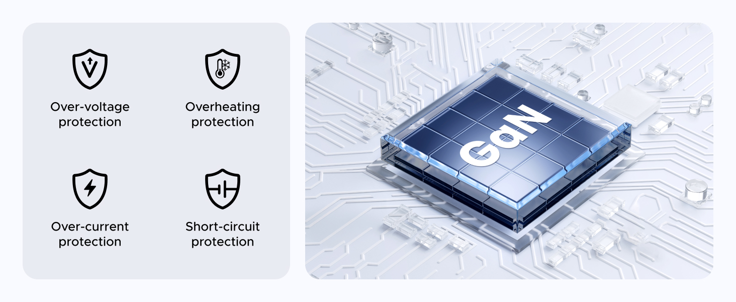 Professional Grade Charging Protection: This USB-C power adapter utilizes advanced GaN technology and a multi-protection system to safeguard your devices in real-time against over-voltage, short circuits, overheating, and overcharging; Its flame-retardant casing ensures an even safer charging process