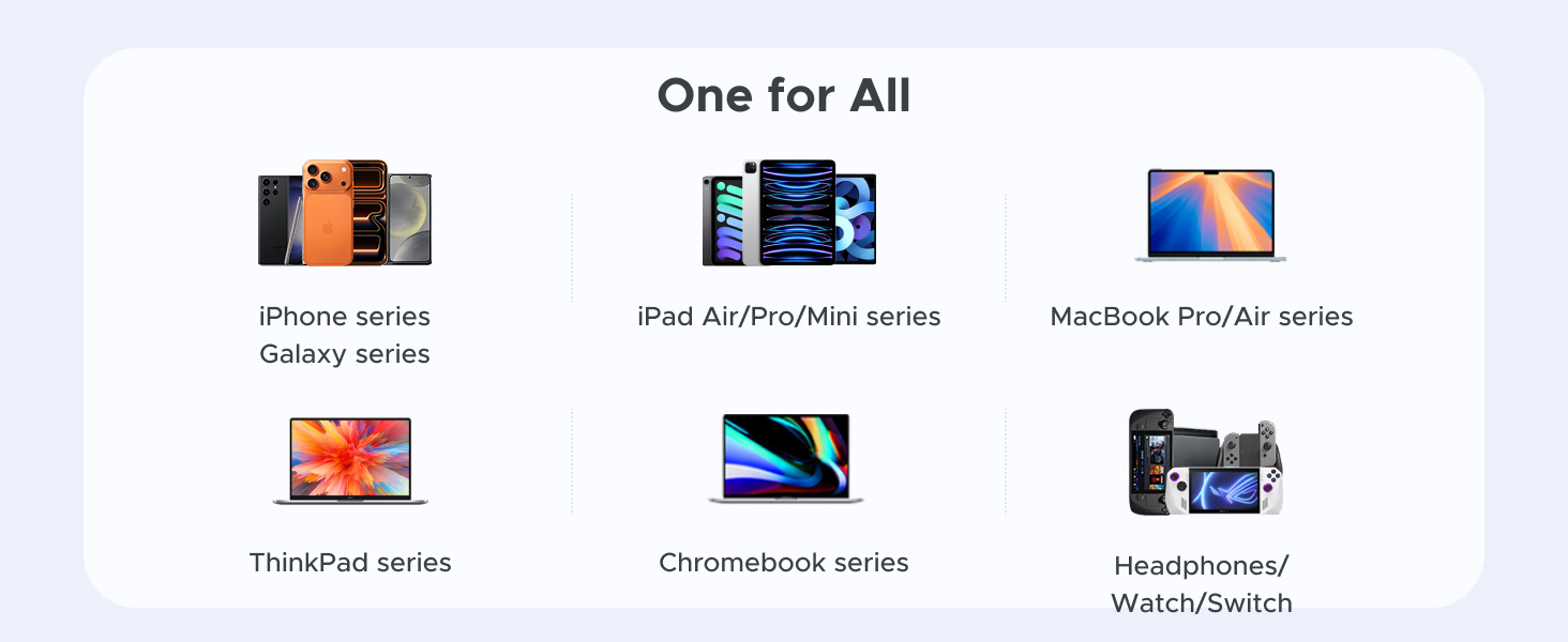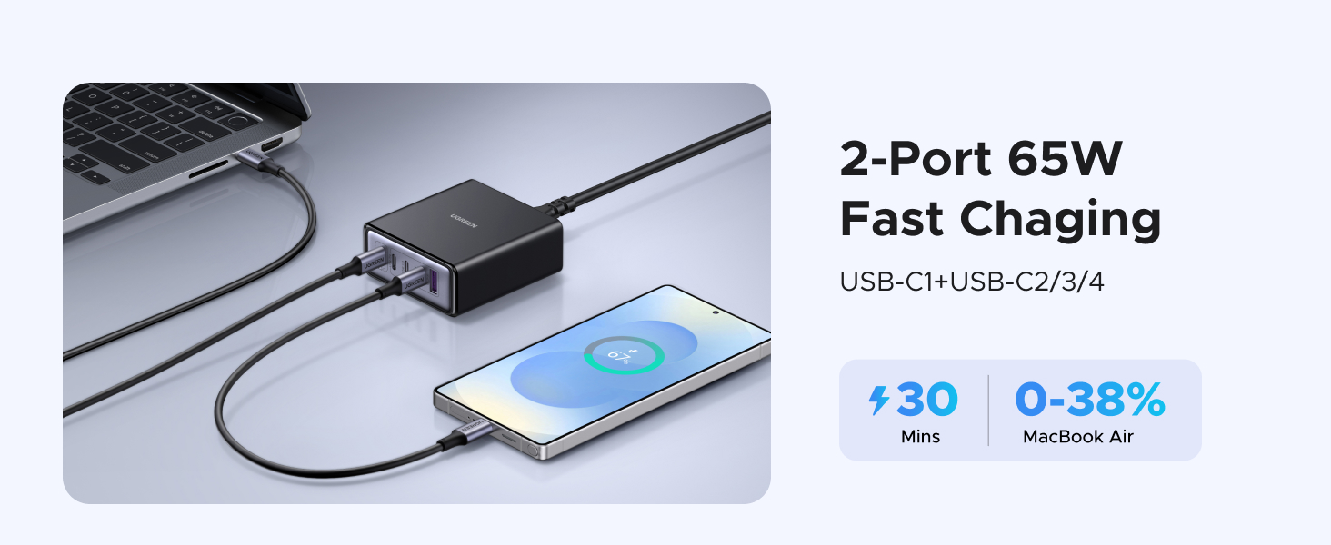 45W Super Fast Charge: The USB-C1 port supports multiple fast-charge protocols (PD/PPS/QC/AFC, etc.), delivering up to 45W of power. It can charge an iPhone 16 from 0% to 60% in just 30 minutes; Additionally, the Galaxy S25 Ultra can be charged from 0% to 67% within 30 minutes(A 5A PPS cable is required ); Stay energized, efficient, and productive