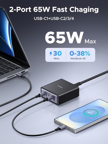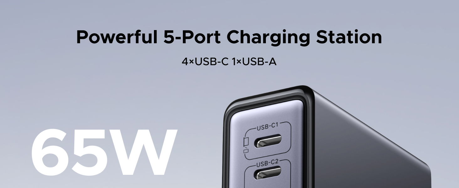 65W Charging Station: This UGREEN USB-C charger features 5 ports (4×USB-C & 1×USB-A) with a total output of up to 65W, making it a professional and efficient charging solution for your desktop setup; Whether at home, in the office, or on the go, this versatile charging hub saves you time and effort