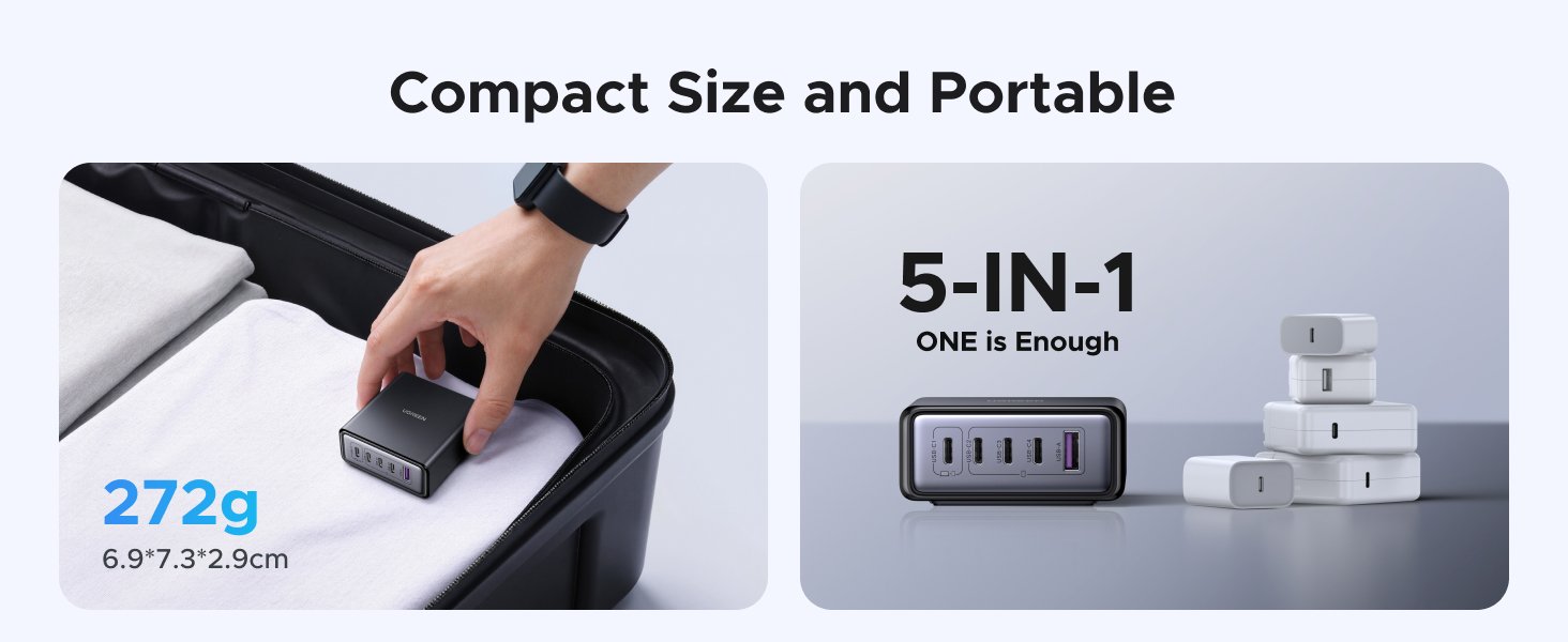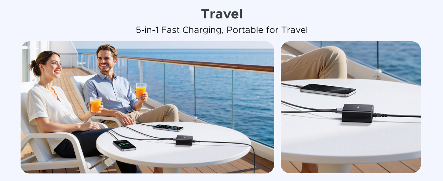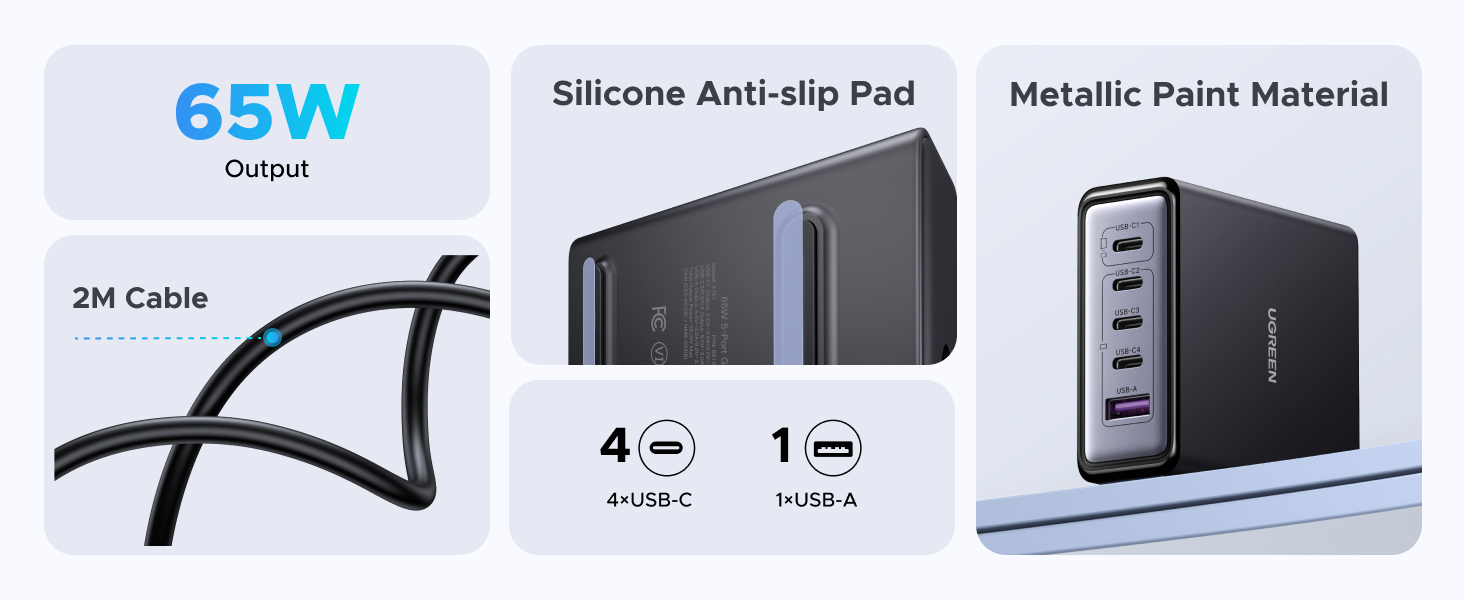 Premium Design: This 5-in-1 USB-C fast charger features a compact build with a 2-meter power cord, saving desktop space while remaining easy to pack in a suitcase or backpack for travel; The metallic finish and anti-slip silicone feet enhance the refined charging experience