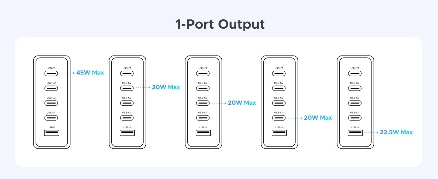 5-in-1 Charger: Charge up to 5 devices simultaneously; The USB-C1 port (max 45W) delivers lightning-fast charging speed for your iPhone/Galaxy/iPad series and MacBook Air; Meanwhile, this desktop charging dock provides continuous and safe power for your devices like smartwatches and wireless headphones; One charger is all you need – unlock your full potential