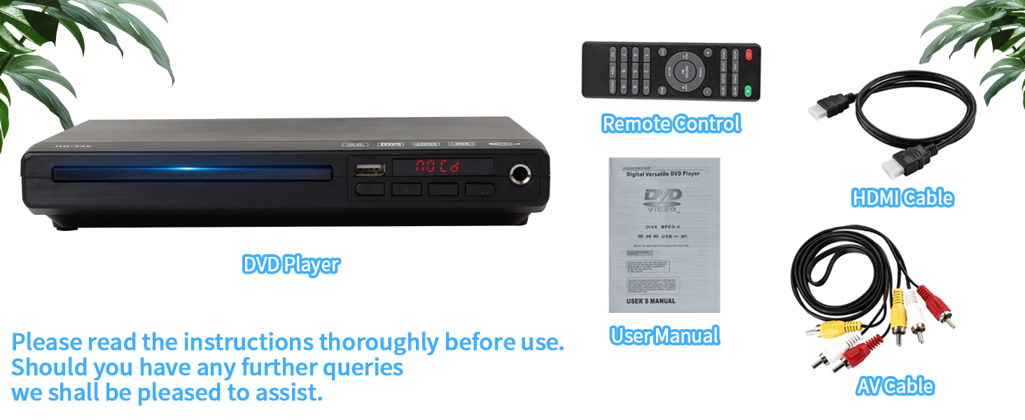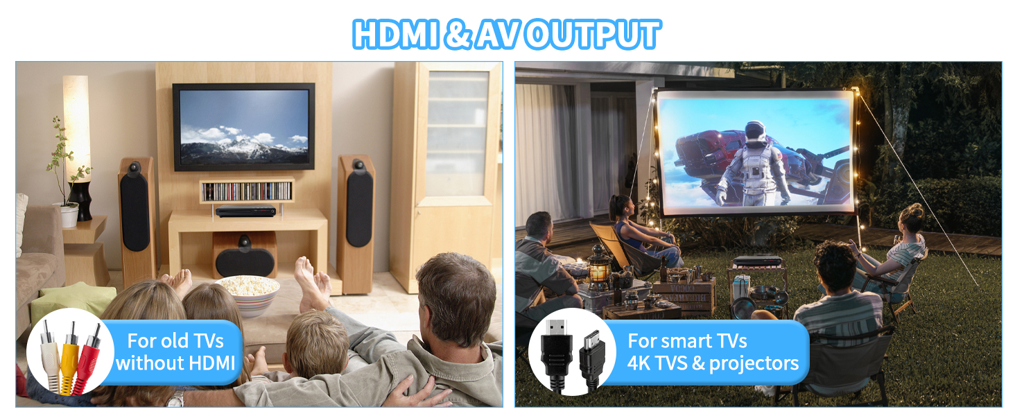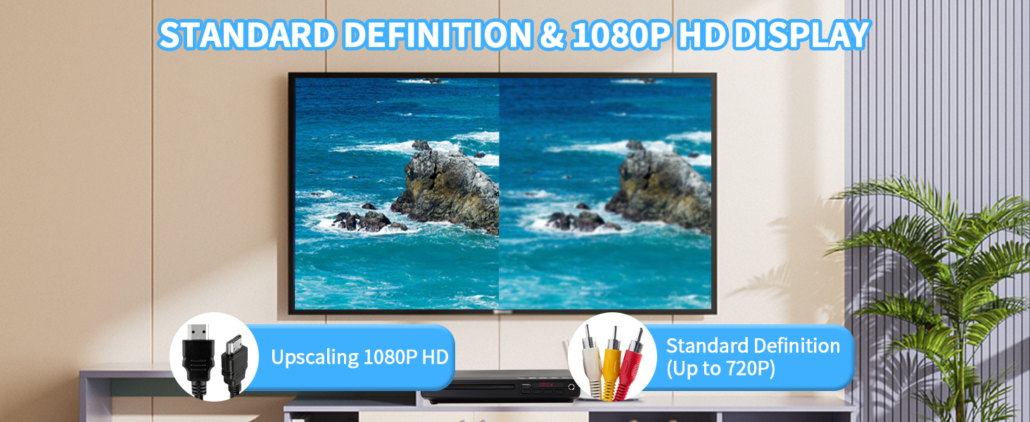 - Modern HDMI & Legacy AV: Along with a modern 1080P HDMI port for HD viewing, we include a standard AV cable, which makes our DVD player perfectly compatible with virtually any television set in your home, from the newest smart TV in the living room to the older set in the bedroom or holiday cottage. The DVD player for TV upscales your films to 1080p via HDMI cables, delivering a sharper and smoother picture on modern TVs for a immersive home cinema experience