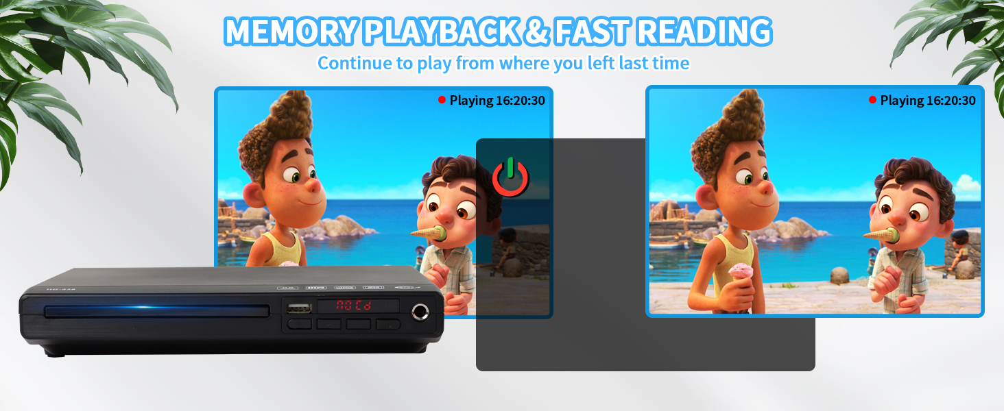 - Memory Playback Feature: The multi-region DVD player retains your viewing position after shutdown, enabling seamless resume playback. Updated chip technology ensures the portable DVD player operates quickly and quietly, delivering a smooth and reliable viewing experience. Anti-skip and error correction features of the video player ensure a smooth, reliable viewing experience, making it the ideal media center for your living room, bedroom, study, or even caravan