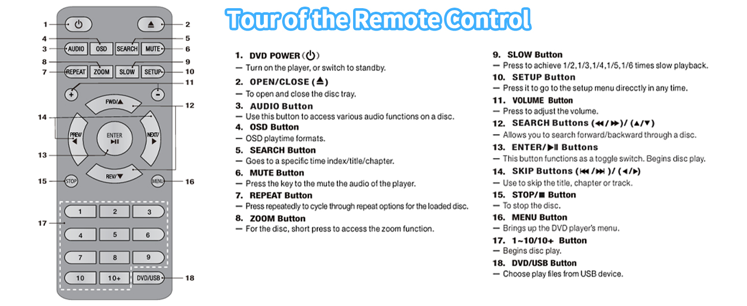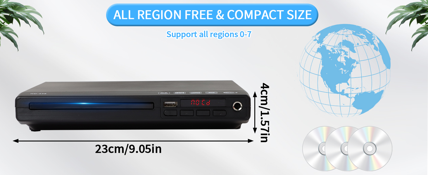 - Multi-Format & All-Region Playback: The multi region free DVD player supports all region codes (0-7) and is compatible with a wide range of disc formats, including VCD, SVCD, DVD, MPEG4, MP3, CD, CD-R, CD-RW, DVD-R, and DVD+R. It can play music from MP3 discs, view JPG pictures, and play video files in AVI, DTA, VOB, and SAM formats. Please note, it does not support MP4, MKV, MOV, RMVB, RM, 3GP, FLV, WMV video formats or blu-ray discs