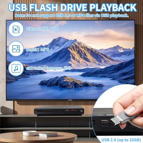 - Direct USB Playback: As a powerful media player, the built-in USB port allows you to directly play your digital files, enjoy videos (AVI, VOB), music (MP3), and easily view photos (JPG) from your USB drive. The DVD media player supports USB 2.0 with a maximum capacity of 32GB. It does not support USB 3.0 or MP4 files via USB playback. Compressed images stored on the USB drive must be decompressed to display and play properly