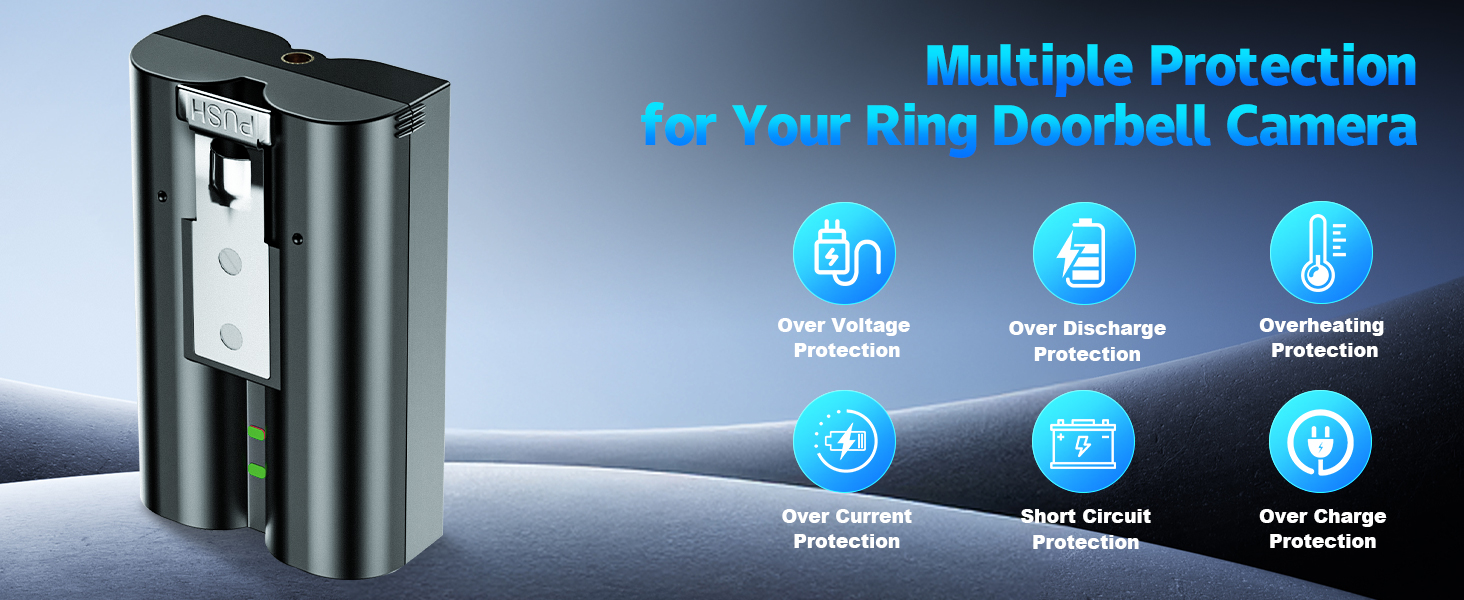 【Six-Layer Safety Protection】Our ring quick release battery pack features six-layer safety protection mechanisms, covering overcharge, over-discharge, short-circuit, overheating, output overvoltage, and output overcurrent safeguards. Comprehensive protection from cell to circuitry effectively mitigates safety risks during charging and usage, safeguarding both you and your Ring devices.