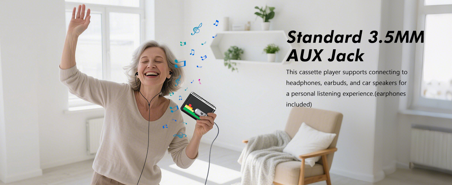 - 【Universal Cassette Player】 Compatible with all types of cassette tapes, letting you relive your old days. The cassette player features a standard 3.5mm audio jack for connecting to headphones, earbuds, or your car stereo for a customized listening experience (a pair of earbuds is included).