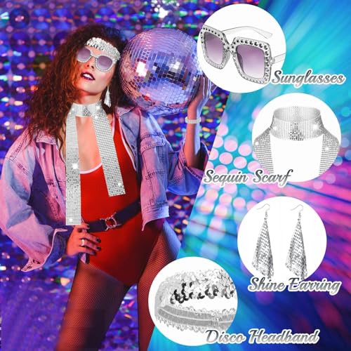 UxClishe 7 Pcs 1970s Disco Costume Set for Women, 70s Shine Disco Fancy Dress Accessories Set with Sequin Skirt Glasses Scarf Earring Headband Prom Dancing Outfit for Retro Party Supplies