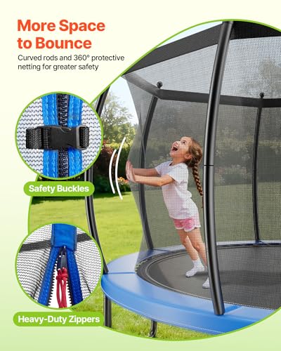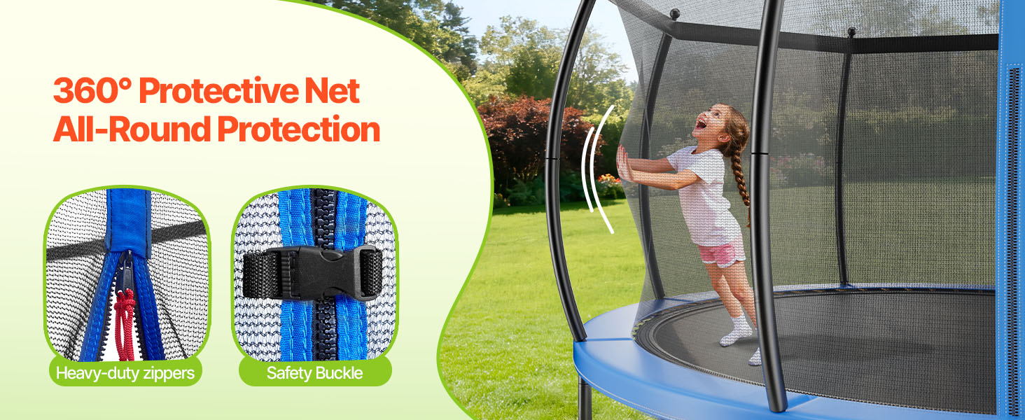 360° Security Protection: The kids trampoline features upgraded curved poles and a soft-touch enclosure net with zipper and buckle locks that offers full protection for kids. Thick, waterproof padding covers the springs and mat gaps for safer play.