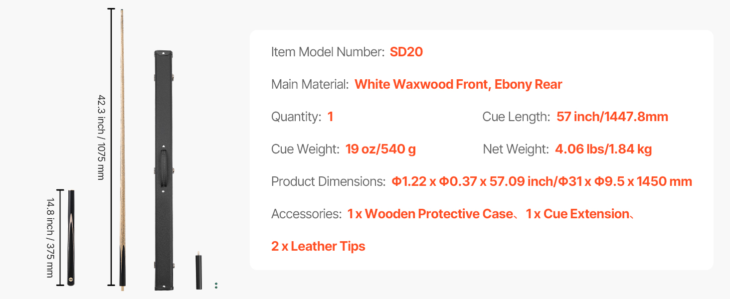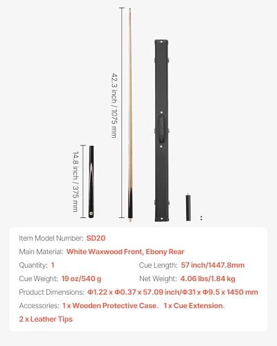 - Ideal for Beginners: Designed for convenience, this 57 inch/1447.8mm, 19 oz/538g pool stick has a 3-piece construction that allows for easy storage and portability. Ideal for beginners, it ensures a comfortable and controlled playing experience