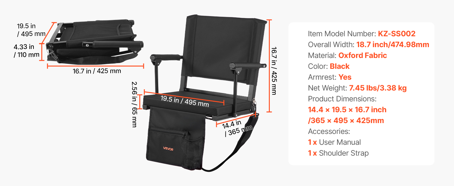 Wide Armchair Comfort: This portable bleacher seat is made with a lightweight steel frame, thick high-density foam, and 600D waterproof Oxford fabric. The 95° backrest offers cushioned support, while the 19-inch/482.6mm wide seat with armrests accommodates most users for comfortable viewing during sports events