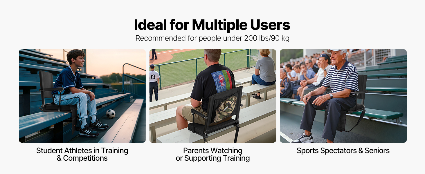Easy Carry Seat: VEVOR bleacher seat folds in a single step and comes with a shoulder strap for portability. Suitable for student athletes, accompanying parents, and spectators, it occupies minimal space and fits easily in your car trunk for transport