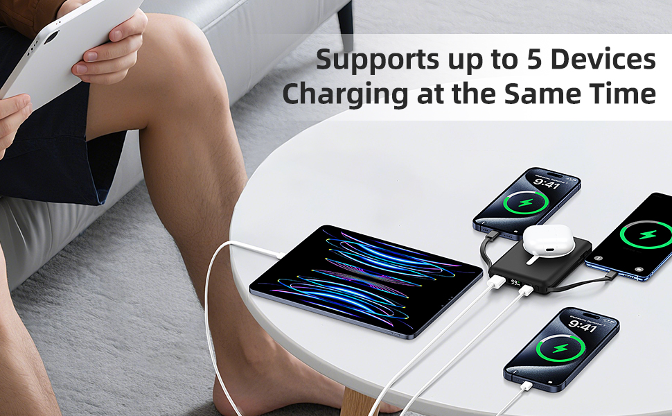 【Charges 5 Devices Simultaneously】This power bank equipped with 4 outputs and wireless charging 5W/7.5W/15W wireless charging 20W PD USB-C. Magnetic wireless power bank can charge 5 devices at the same time without power failure, effectively solve the charging needs of multiple devices