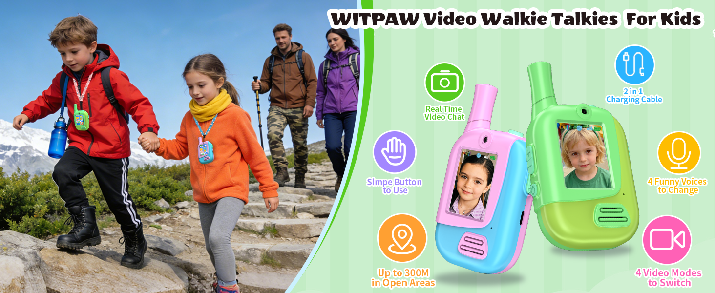 - 4 Playful Voice Effects:WITPAW Video Walkie Talkies for kids boast 4 entertaining voice-changing settings: child, original,alien,and robot! Kids will adore the playful video interactions enabled by these kids video walkie talkies, which liven up their playtime.Suitable for 3-12 years old toddlers and older kids,this walkie talkies for kids 2 pack works great for outdoor activities like camping,hiking and family games.