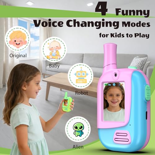Video Walkie Talkies for Kids 2 Pack, 300M Range Kids Walkie Talkies Rechargeable 4 Changer Voice for 3-12 Year Old Boys Girls,Toys Video Intercom for Outdoor Games Adventure Camping(Pink&Green)
