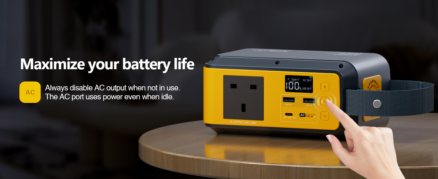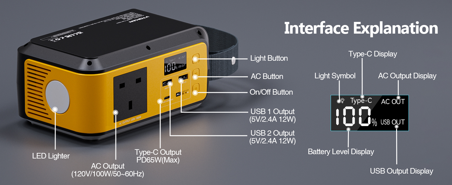 【Versatile output interfaces cater】 VTOMAN Jump 100 Portable Power Station offers an AC output port (rated at 100W), two USB-A ports (5V/3A, 9V/2A, 12V/1.5A), and one Type-C PD input/output port 65W. For USB-A port, you must press the power button to output normally.This diversified interface design can almost meet all your daily device charging needs