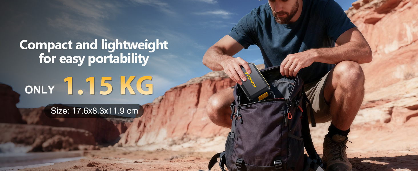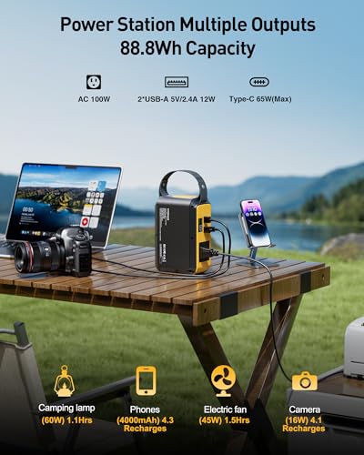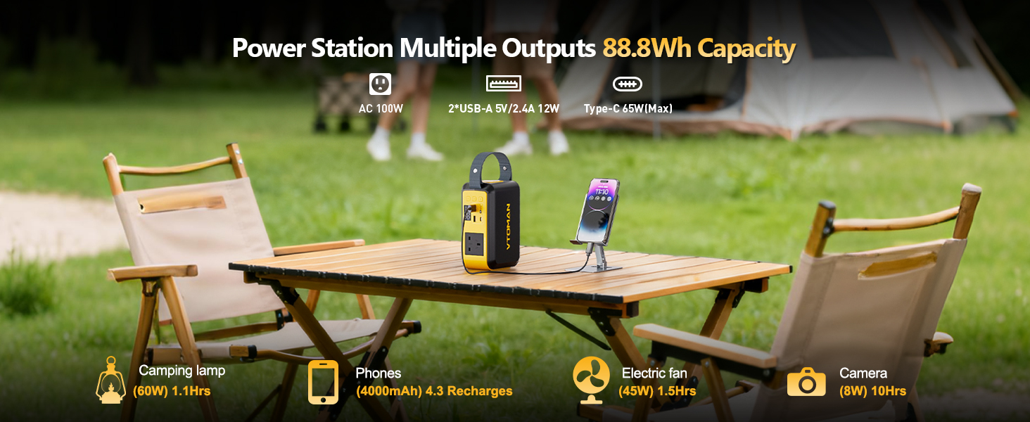 【88.8Wh-battery meets diverse needs】 VTOMAN Jump 100 Portable Power Station (88.8Wh) can charge various electronic devices, such as a mobile phone about 4 times, a laptop about 1 hour, a camera about 4 times, a camping lamp about 1 hour, a drone about 1.6 times, and a fan about 1.5 hours. the power station is small enough to fit into a backpack.Featuring an LED screen to track battery and output status, along with flight-safe capacity, it serves as an ideal power supply for travel, outdoor