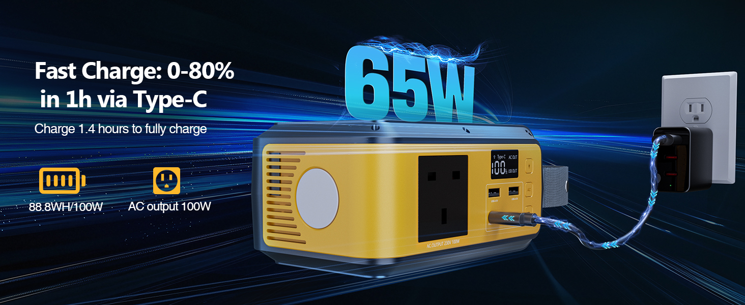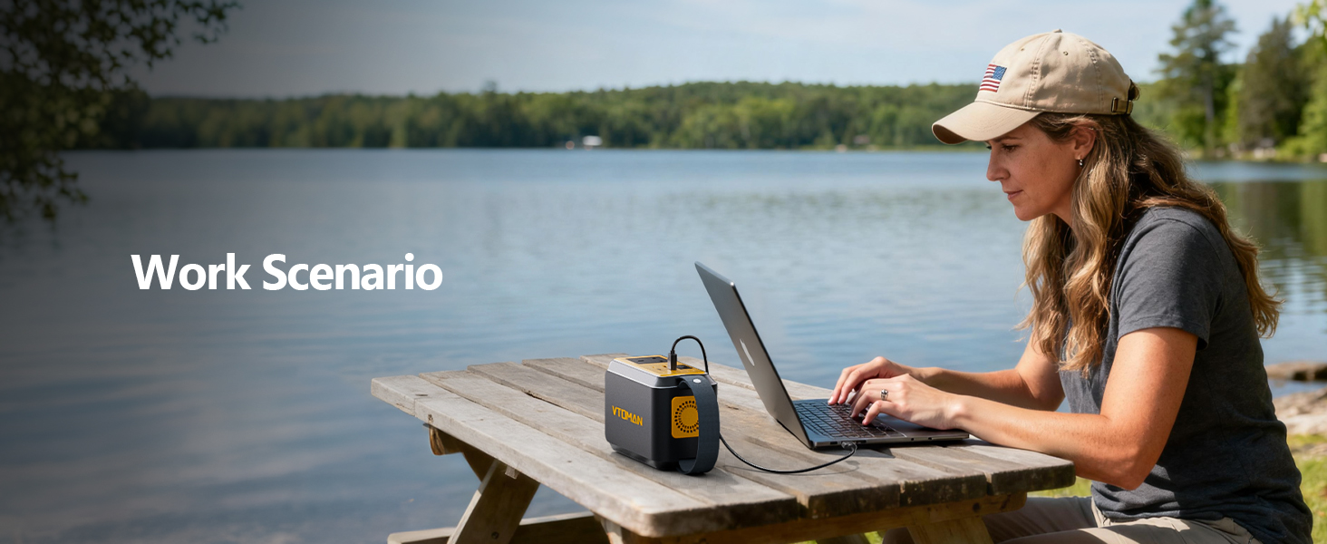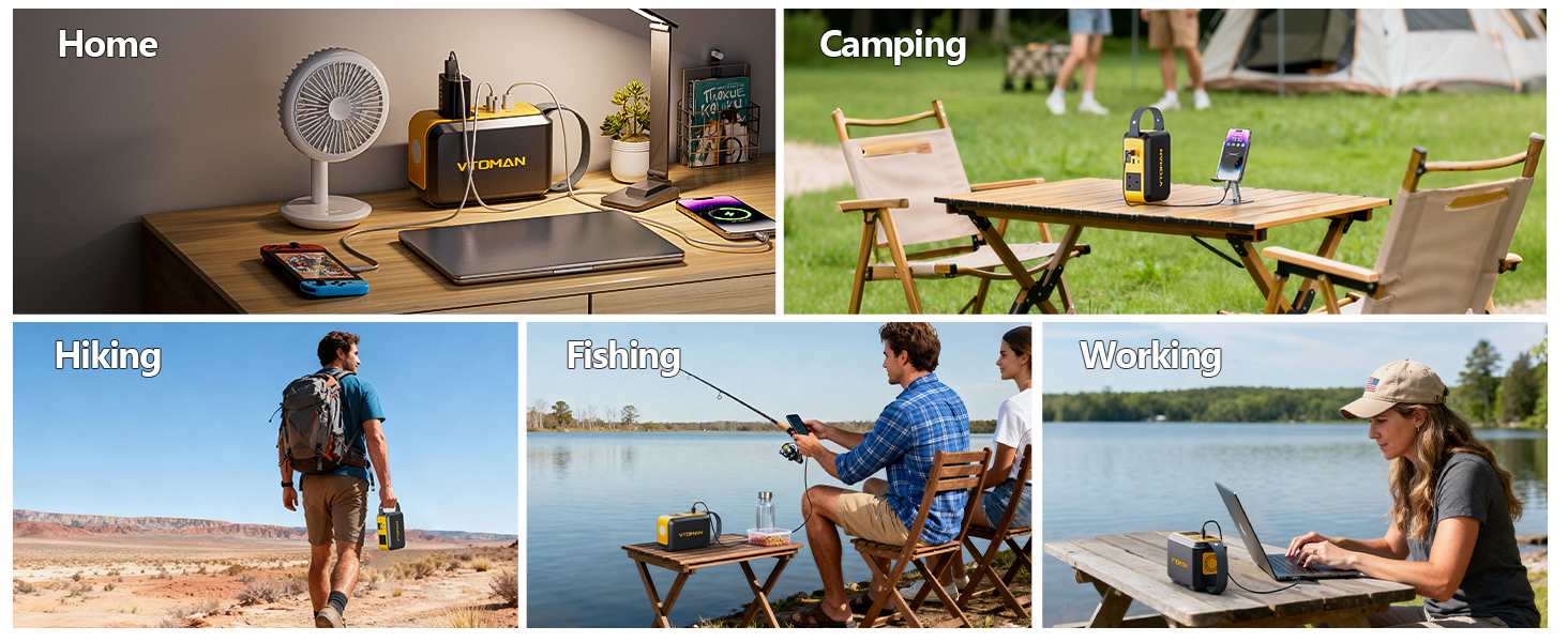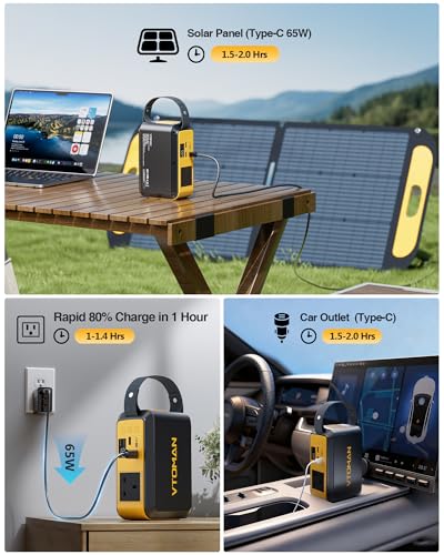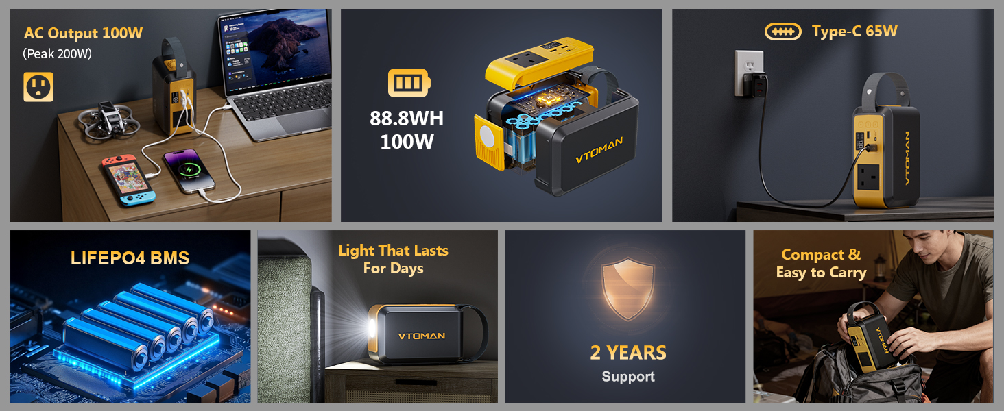 【100W AC Outlet with 65W PD 】 VTOMAN Jump100 Portable Power Station has a wide range of gear with the 100W AC outlet (200W peak), from a laptop and mini fan to a CPAP machine and portable projector. The 65W USB-C PD port fast charges or tablet, while two USB-A ports keep your phone, bluetooth speaker, and other electronics running simultaneously during outdoor travel or a power outage"