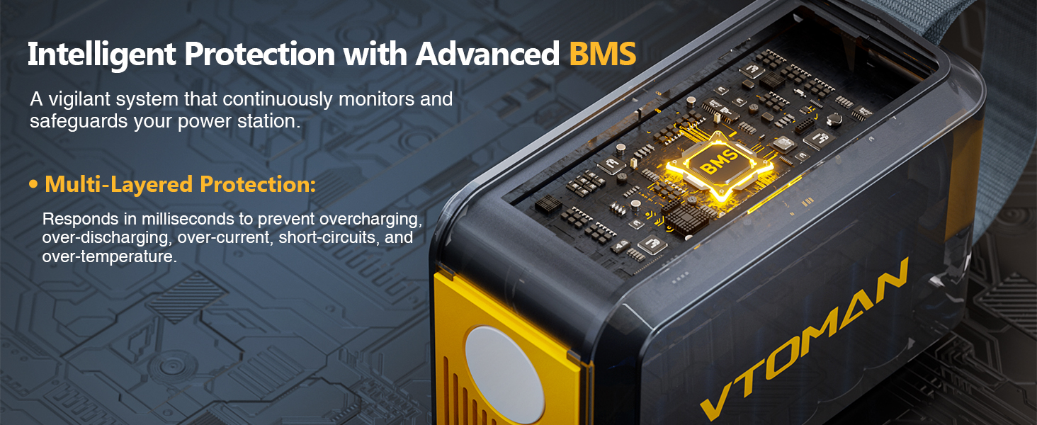 【SuperSafe LIFEBMS Power Station】VTOMAN Jump 100 Portable Power Station features a super safe LIFEBMS protection system developed, which provides multiple protection for the battery, including Over-Charge Protection, Over-Discharge Protection, Over-Voltage Protection, Over-Current Protection, Short-Circuit Protection, High-Temperature Protection,etc