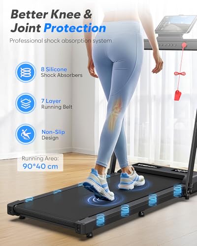 【Anti Slip & Shock Absorption】This walking pad for home office features a spacious 90 × 40cm running belt for comfort and safety. Equipped with a 7-layer anti-slip belt and 8 silicone shock absorbers, it provides a smoother workout and reduces impact on your joints—helping protect your knees during every step.