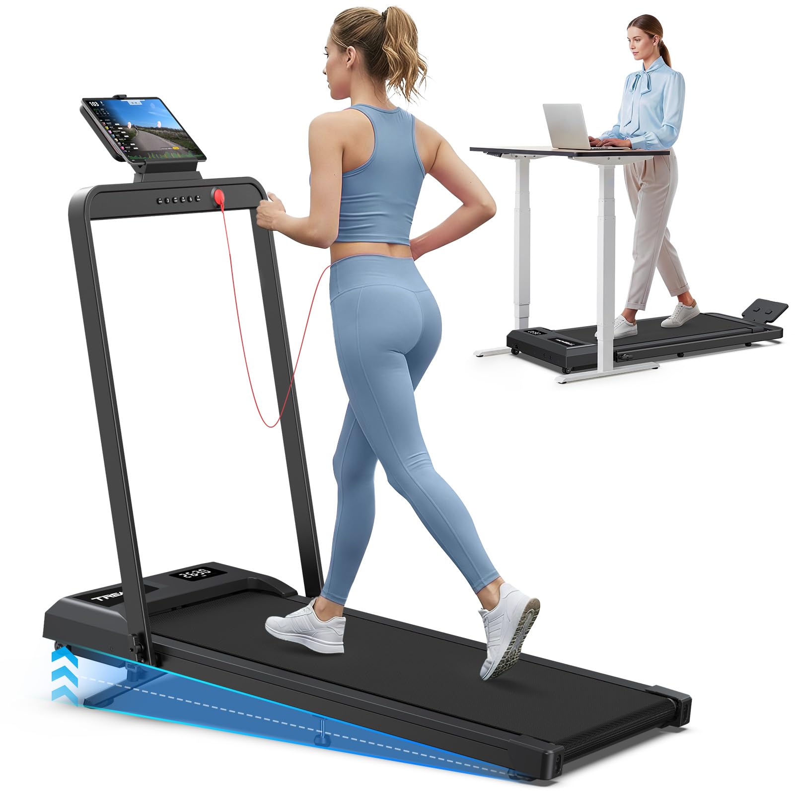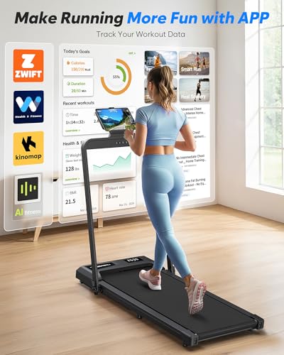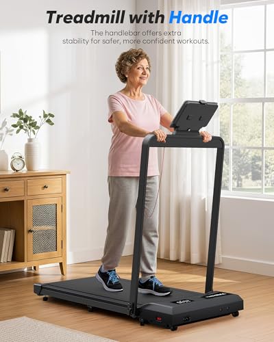 【Treadmills for Home Foldable】The 2 in 1 Folding treadmill offers two modes to fit your lifestyle: Running Mode (1–10 KM/H) for an intense workout, and Walking Mode (1–6 KM/H) for light exercise while working. The portable treadmill is perfect for use under your desk, while the remote control with one-touch mute makes speed adjustments effortless. A built-in phone/tablet holder lets you watch movies or join work calls as you walk, keeping workouts productive and enjoyable.