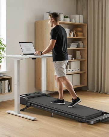 【Pre-installed & Space Saving Design】No assembly required—this under desk treadmill is ready to use right out of the box. Its slim, sturdy design and smooth-rolling wheels make it easy to move and store under sofas, desks, or beds (just 4.4" tall when folded). You can also place it against a wall, making it perfect for small apartments, dorm rooms, or any tight space.