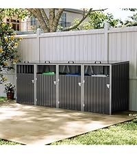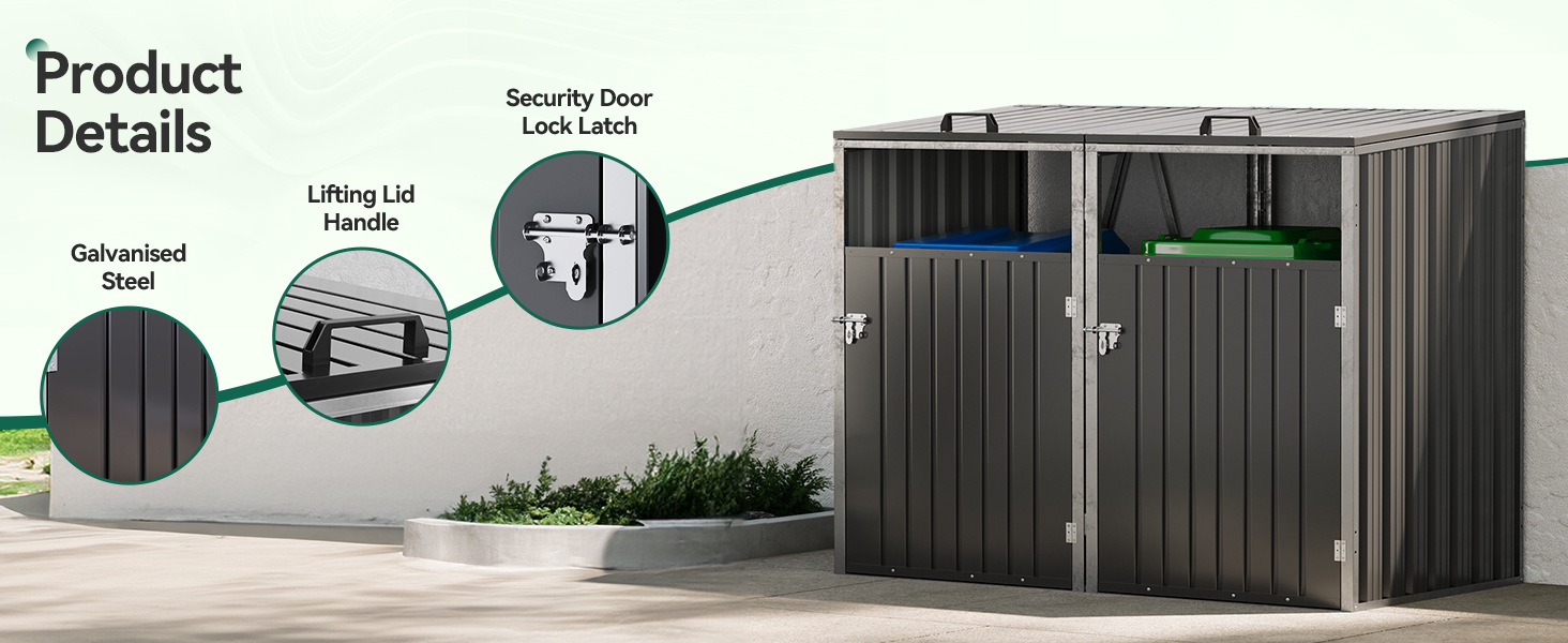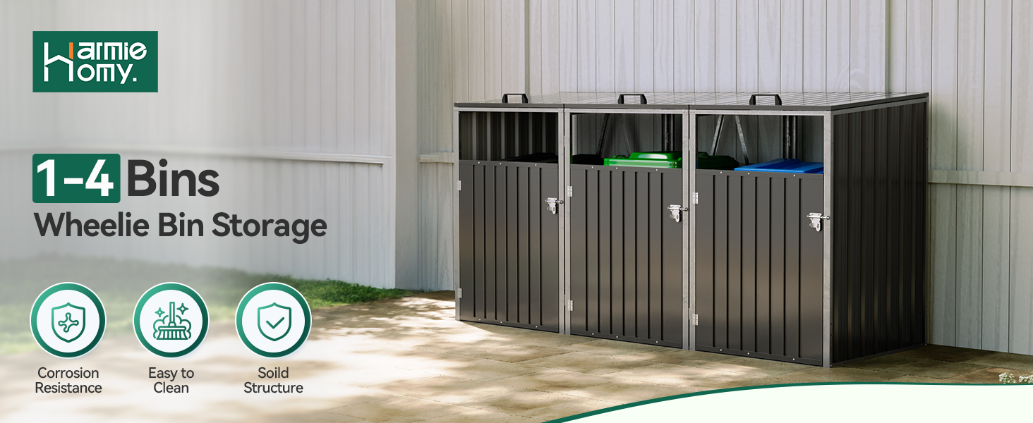 【Sturdy Galvanized Steel Construction】Crafted from powder-coated galvanized steel, this wheelie bin storage boasts exceptional strength, superior corrosion resistance, and excellent heat resistance. It’s built to withstand harsh outdoor conditions, ensuring long-lasting durability of reliable use.