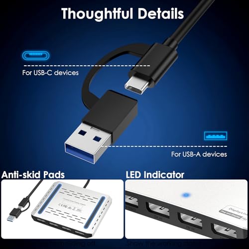 Hybrid 2-in-1 USB Cable: The Displaylink Quad DP Adapter equipped a hybrid 2-in-1 cable, allowing for easy connectivity to USB-C, USB-A, Thunderbolt 3/4, and USB 4 ports, providing versatile compatibility with different devices. Once connected, you can effortlessly mirror or expand your screen content for greater productivity.