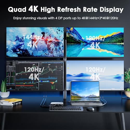 Quad 4K@60Hz Simultaneous Output: The Displayport Splitter for quad monitors delivers max four 4K@120Hz displays from a single Thunderbolt, USB4, USB-C or USB A 3.0 port. Designed for seamless compatibility, this DisplayLink adapter adds four extended screens to all M1, M2, M3 and M4 Macs.