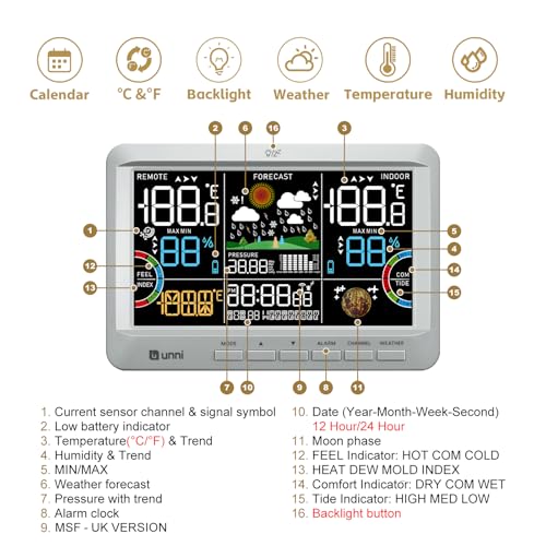Upgraded Mold Dew Heat Index – See indoor outdoor conditionsvisual depicition of current temperature with future forecasts. Weather icons are determined by your`s barometric pressure reading, allow 7-10 days to calibrate. Additional functions for your daily use: Comfort Indicator, Tide Indicator, Feel Index.
