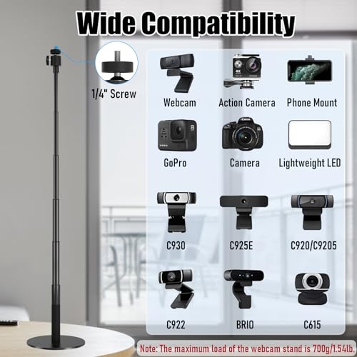 - 【Wide Compatibility】Equipped with a 1/4”thread, the stand is compatible with most webcam that have a 1/4” screw hole, including Logitech C925e, C922x, C922, C930e, C930, C920, C920S, C920X, C615, Brio, and NexiGo N60. Note: maximum load capacity 1.54 lbs (0.7 kg).
