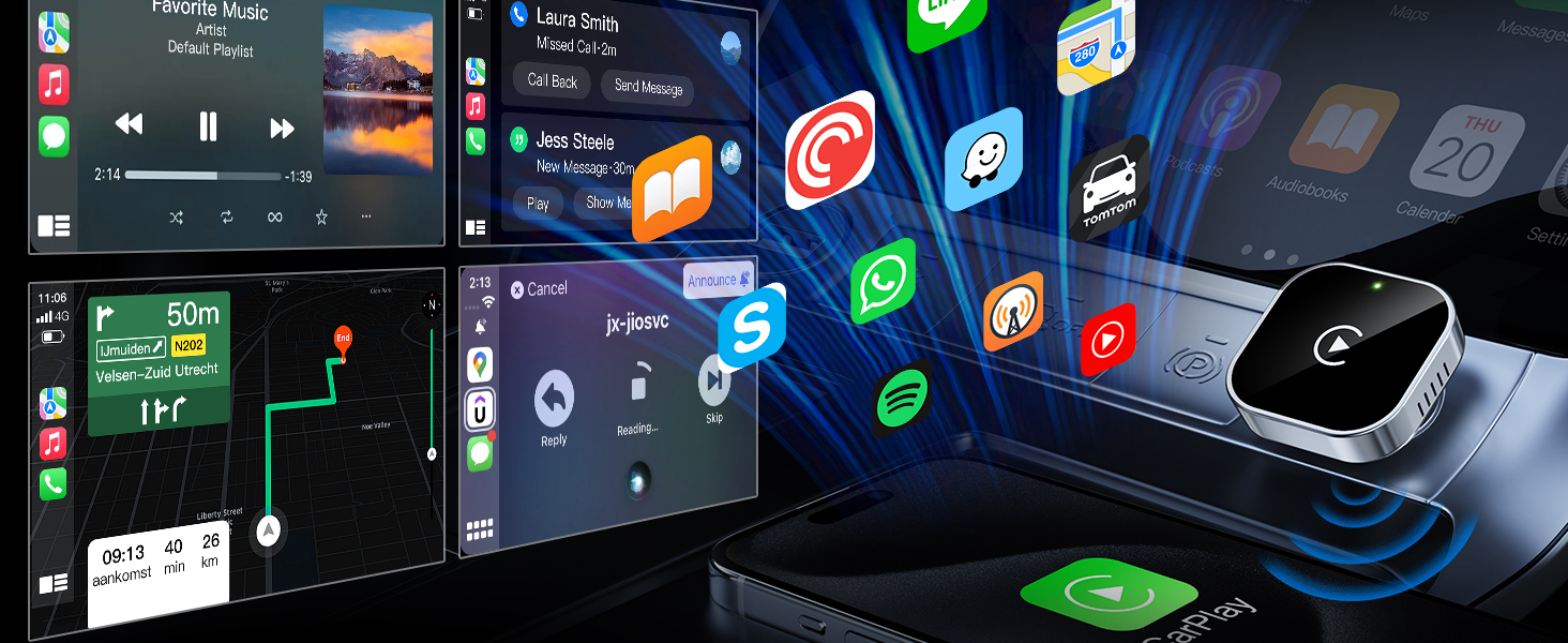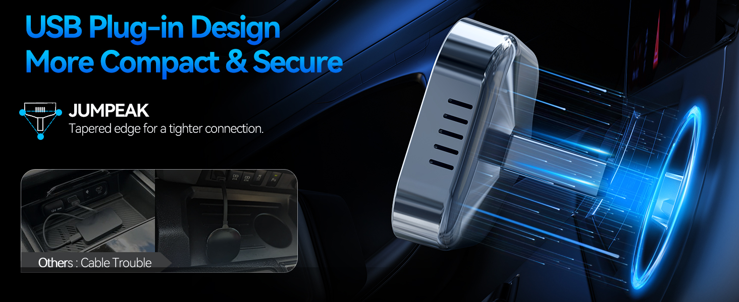 Revolutionary Mini Design, 50% Smaller – The ultra-compact and sleek Jumpeak wireless CarPlay adapter fits almost flush in your car’s USB port, blending seamlessly into your vehicle’s interior for a clean, minimalist look without clutter. With our upgraded, nearly invisible adapter, effortlessly add wireless functionality to your car's original CarPlay and enjoy wireless access to CarPlay features like music, maps, calls, and more.