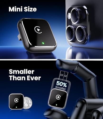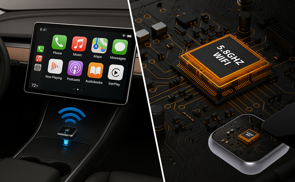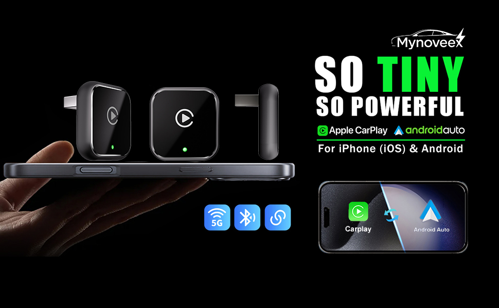 The latest 5 GHz WiFi dongle that transforms a small wireless CarPlay adapter into a mini and portable carplay adapter. Thinner and lighter than you'd imagine, it maximizes space efficiency and reduces clutter, fitting in 98% of vehicles while combining functionality and elegance. Simply plug it in once and enjoy automatic Bluetooth connection.