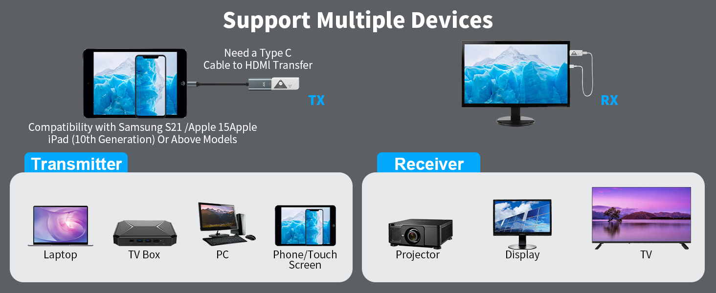 - Wireless Mirroring & Extended Display: Wireless HDMI transmitter and receiver choose between mirroring or extending your screen to adapt to your needs. Effortlessly project content from laptops, cameras, or TV set-top boxes to HDTVs, projectors, or monitors, offering a versatile, multi-functional experience.