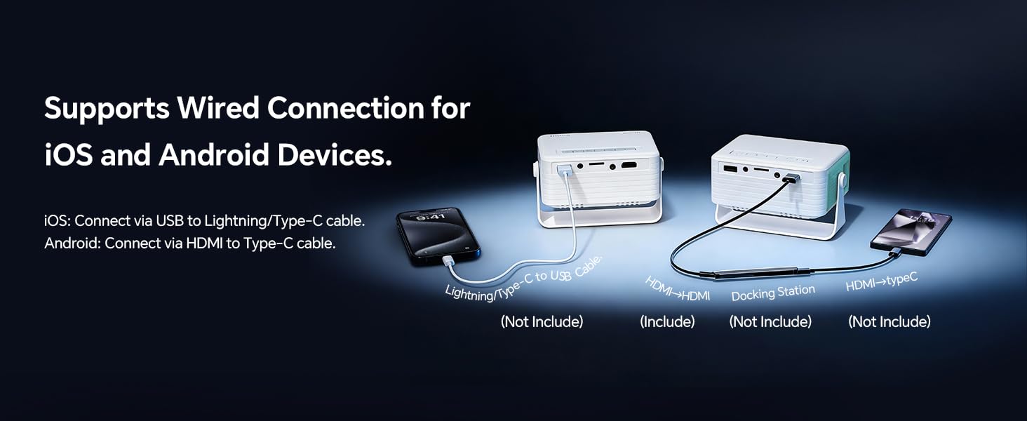 - 【iOS & Android Dual Connection】It’s a nice phone projector that works seamlessly with iOS & Android devices: Wired – Plug & play with your iOS charging cable directly; Android devices require an HDMI adapter. Wireless – Enjoy seamless streaming without cables, simply connect via a Dongle. (Contact our support team if you need a dongle.)