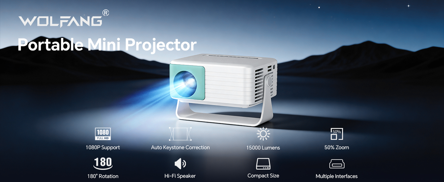 WOLFANG Mini Projector, Home Cinema Projector for Bedroom, Portable 1080P Full HD Supported with Auto Keystone Correction, 50% Zoom & 180° Rotation, Compatible with iOS/Android/Switch/Laptop/TV Stick