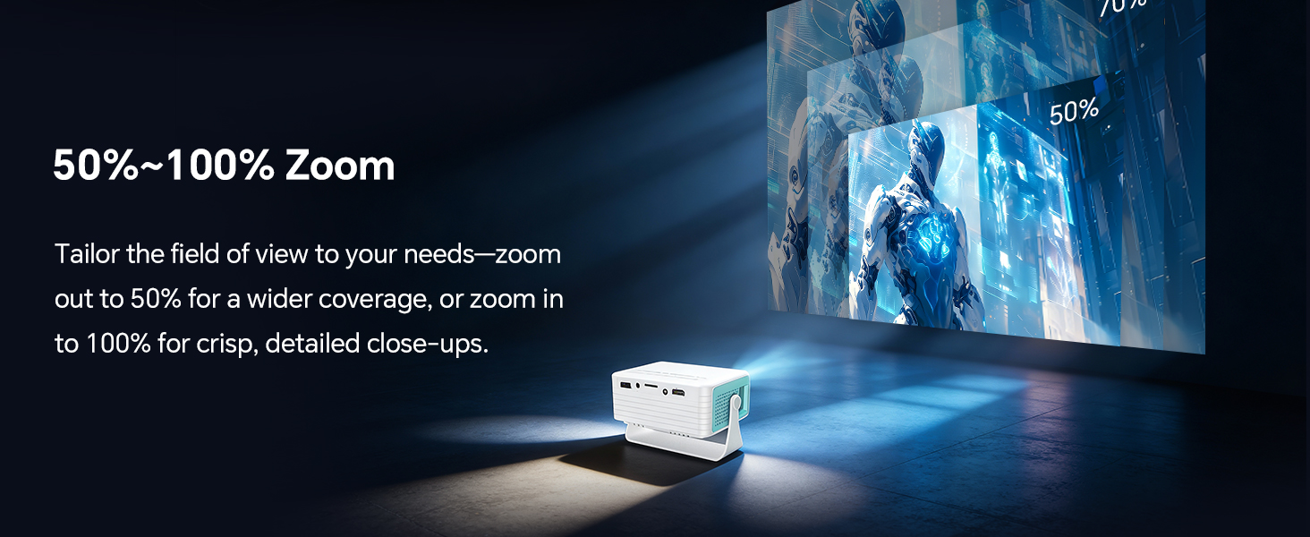 - 【Flexible Adjustment with Zoom & 180° Rotation】 Equipped with a 50% digital zoom to adjust image size without moving the projector, maintaining clear focus. The 180° rotation allows flexible mounting and viewing angles, suitable for home theaters, bedrooms, or office use.