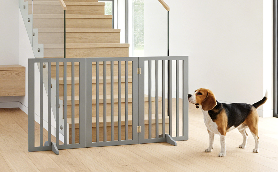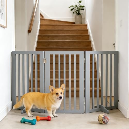 Wooden Stair Gate for Dogs, Freestanding Foldable Dog Gate Indoor with 2 Support Feet, 3 Panel Pet Gate & Dog Guard for Stairs, Doorways and Hallways (140 W x 60.5 H) (Gray)