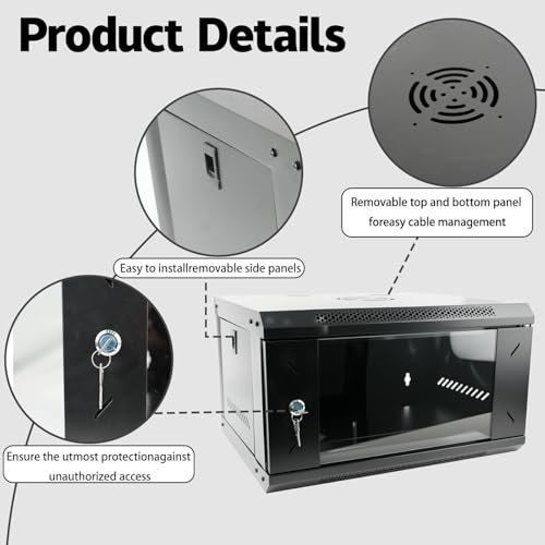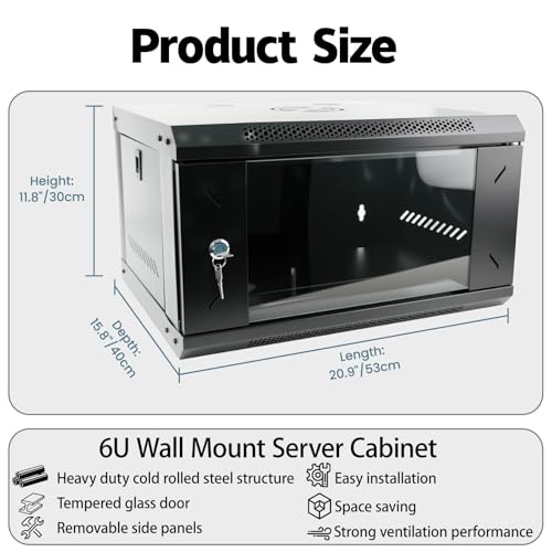 WUDLEP 6U Wall Mount Network Server Cabinet, 55lbs Weight Capacity Network Rack Vented Enclosurewith Locking Glass Door Side Panels, Cable Organizer for IT Equipment and A/V Devices, Black
