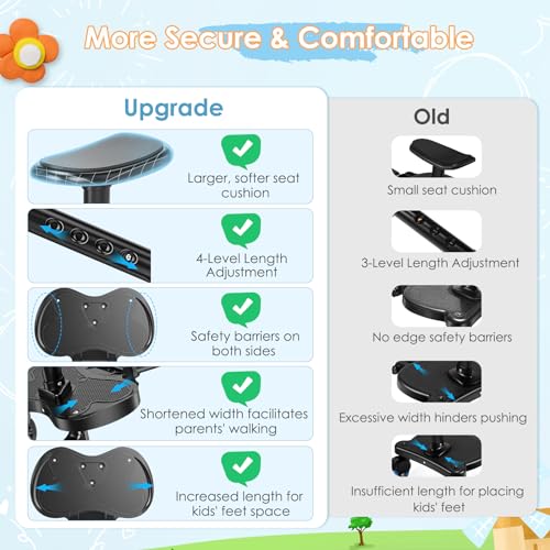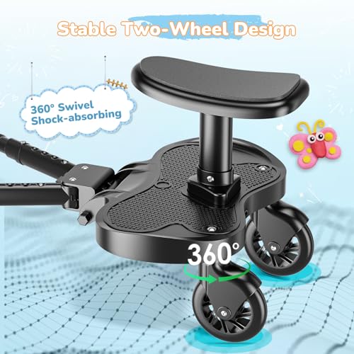 - Safe, Comfortable & Smooth Ride- Designed with a non-slip foot area and soft, eco-friendly seat cushion, this buggy board with seat prioritises your child's safety and comfort. The 360° swivel wheels ensure smooth, effortless manoeuvrability and easy pushing on various surfaces.