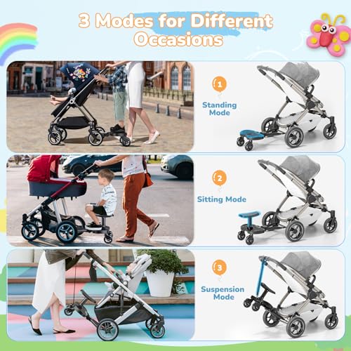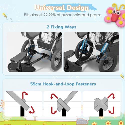 - Universally Adjustable for Easy Installation- Engineered with a three-way adjustable connecting rod (length, height, and width) and a universal strap, our universal buggy board fits 99% of strollers, including lightweight and three-wheel models. Installation is quick and tool-free. When not in use, it can be hung from the pram handlebar to save space.