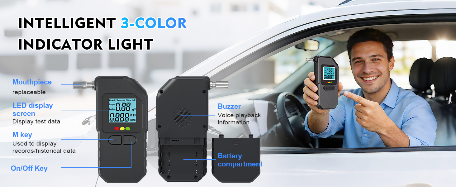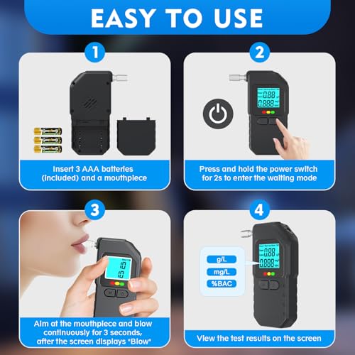 ✅ Easy to Use: You just need to insert the included battery and nozzle into the breathalyser, turn it on, aim it at the mouthpieces and blow continuously for 3 seconds, and then your alcohol concentration will be displayed on the screen. Based on your results, the breathalyzer will have corresponding colors (green/yellow/red) and sound indicators to help you make better judgments.