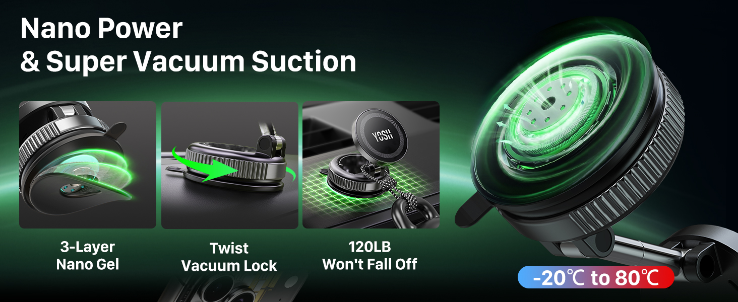 Upgraded Vacuum Plus Adhesive Base: Twist-lock vacuum tech boosts suction by 60%, matched with a 4-layer nano-gel pad for 120 lbs holding force. Retains 99% suction after 1,000+ tests, stays rock-solid from -40°F to 200°F, and outperforms regular adhesive dashboard mounts. Clings tight to smooth/non-smooth car surfaces, never falls on bumpy roads, washable & reusable with no sticky residue
