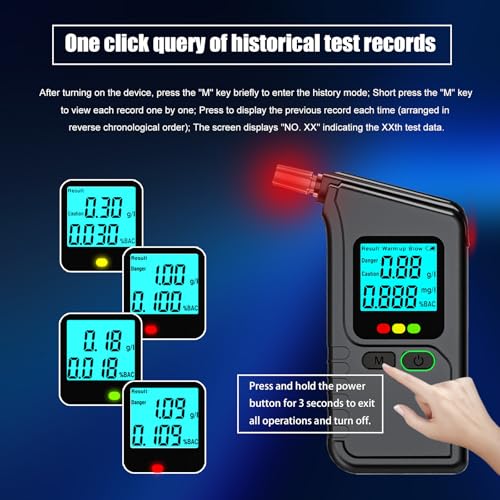【Fast Response Time】Using an upgraded processing chip, this alcohol tester breathalyzer delivers stable readings within seconds. and automatically stores your last 100 test results, helping you track and compare values over time.