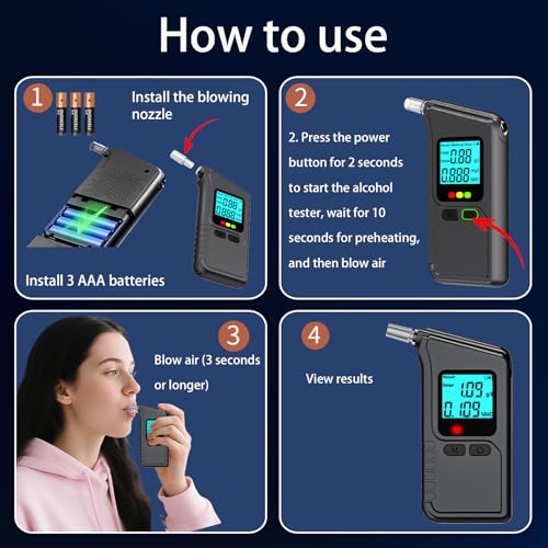 【Easy to use】Just insert the 3* AAA batteries, then need to press the button for seconds to start, and 10 seconds to warm up, then blow for 3-5 seconds, the result will be shown on the LCD screen later. There is 3 unit measurement to choose %BAC, g/l, mg/l, simply double-click the switch.