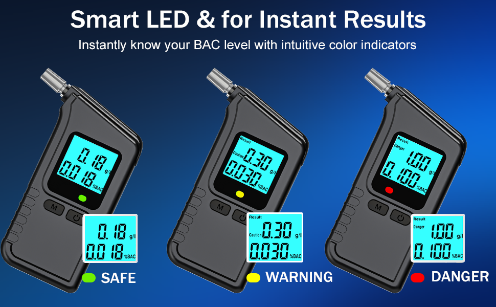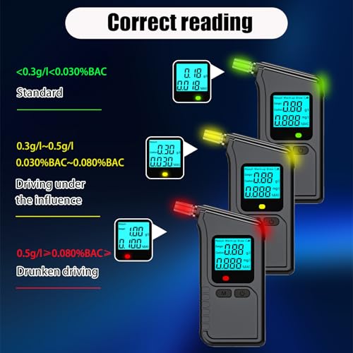 【Auto-Alarm Function】When the test result is greater than 0.3 g / L, 0.03 % BAC, or 0.15mg / L, the indicator light of the alcohol detector will change to inform you so that you can make a better judgment. (Tips: After drinking, wait 20 minutes to perform the test, the result will be more accurate)