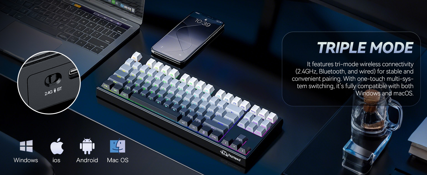 【Versatile Triple-Mode Connectivity】 Enjoy seamless switching between ultra-stable 2.4GHz wireless, energy-efficient Bluetooth 5.0, and reliable wired USB-C connections. Connect to up to 4 devices simultaneously—perfect for your PC, laptop, tablet, or smartphone. Eliminate cable clutter and set up your ultimate command center.