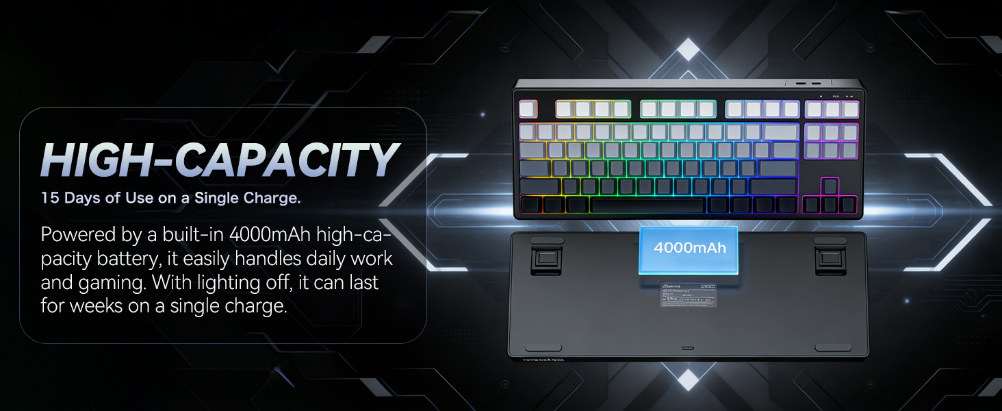 【Massive 4000mAh Battery & Extended Play】 Powered by a huge 4000mAh rechargeable battery, enjoy up to 15 days of uninterrupted use on a single charge (with lighting off). Even with RGB activated, experience days of vibrant gameplay. The USB-C port allows for convenient passthrough charging so you can play endlessly.